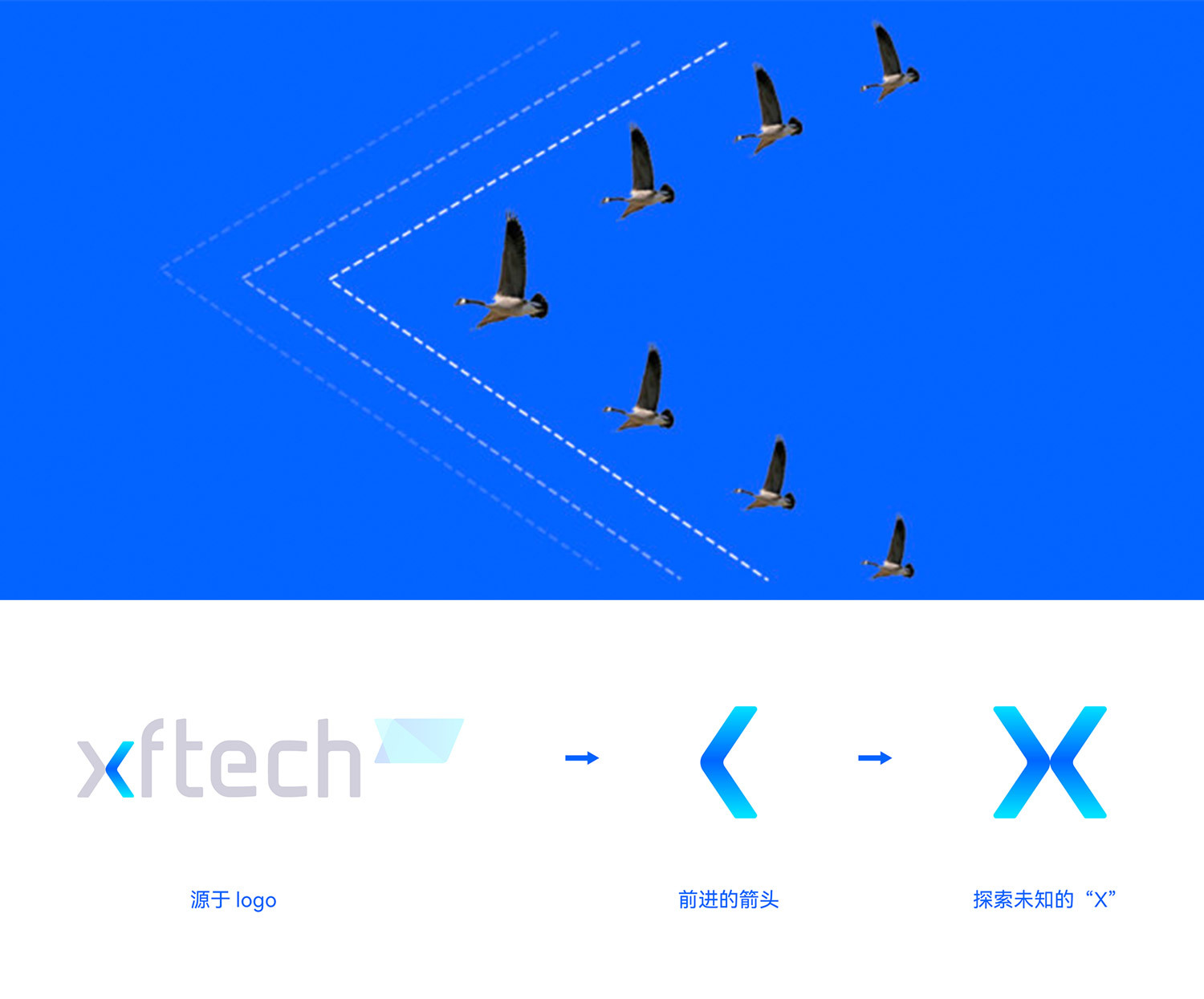 信飛原來的LOGO由圖標(biāo)和中英文字標(biāo)兩部分構(gòu)成,圖形上一眼辨別出「信飛」這個(gè)品牌想傳達(dá)的信息,且原藍(lán)色較為傳統(tǒng)。全新設(shè)計(jì)的LOGO由四部分組成,其中包括英文字標(biāo)「xftech」、中文字標(biāo)「信飛」、一個(gè)藍(lán)色漸變的圖標(biāo)和「X」符號(hào)。