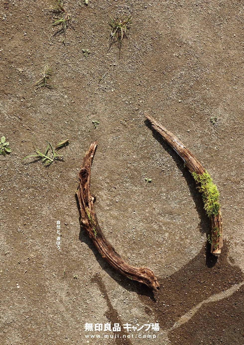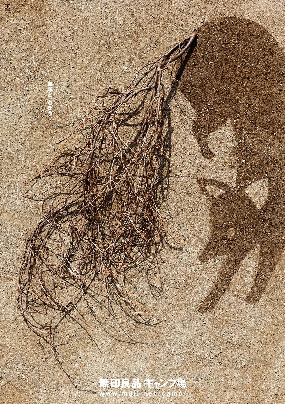 2022年無印良品露營場最新主題海報,以“自然と、遊ほう。”(與自然游玩)為主題。透過用水在地上噴出的陰影與樹枝,巧妙地勾勒出了鹿、狐貍和鹿角蟲等質樸又帶有童趣的形象。
