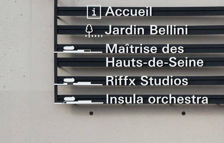 logo取自La Seine Musicale的首字母L、S、M,將其橫向延展, 暗示了獨出心裁的建筑造型。 文字和箭頭標識宛如懸浮在空中一般。為了提高單一建筑的辨識度,將白色的刻字搭配在灰色混凝土和黑色面板之上。在人們最有可能迷路的地方,箭頭像千手觀音一樣指向四面八方,另外還設(shè)置了各式各樣的指示牌。