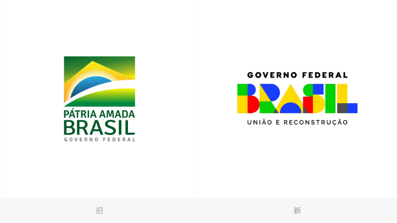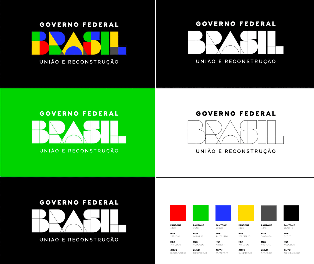 新標(biāo)志由紅色、藍(lán)色、黃色、綠色和黑色幾何色塊疊加出大寫的「BRASIL(巴西)」彩色字母。字母的頂部標(biāo)有黑色的「聯(lián)邦政府」字樣,底部寫有新的主題口號(hào)「União e Reconstruction(團(tuán)結(jié)與重建)」。