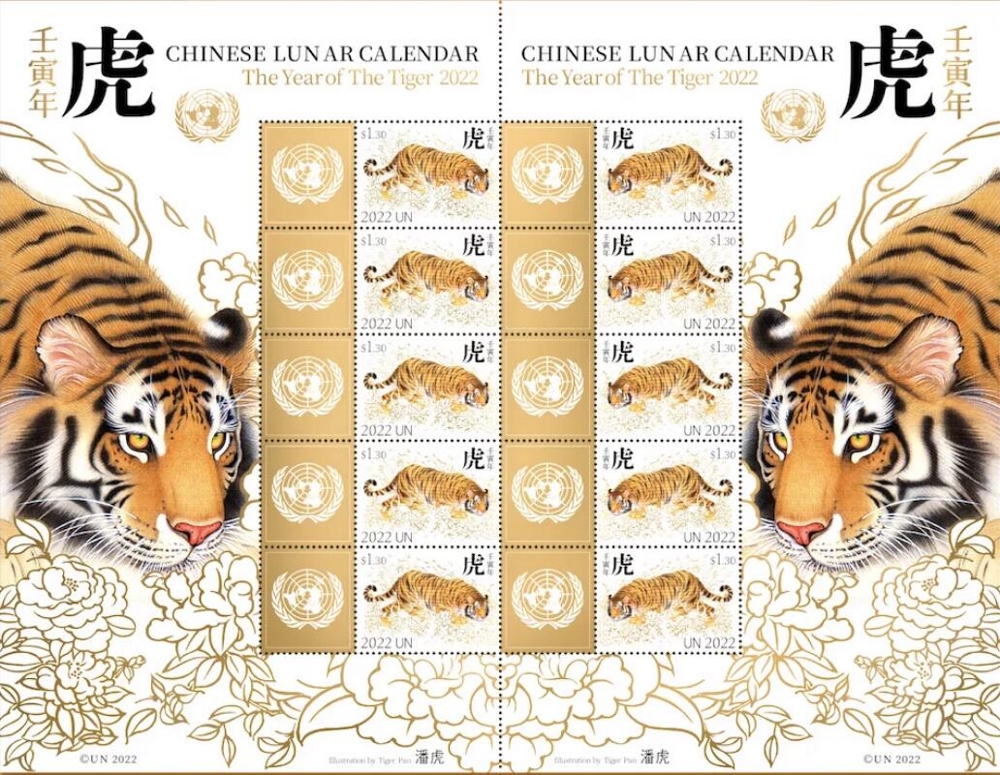 2022年(虎年),潘虎又設(shè)計(jì)了聯(lián)合國“虎票”的圖案。據(jù)聯(lián)合國官網(wǎng)消息,聯(lián)合國郵政管理局負(fù)責(zé)全球設(shè)計(jì)和通信事務(wù)的主管塞爾吉奧·巴拉達(dá)特對虎年郵票的藝術(shù)設(shè)計(jì)予以充分肯定,并稱其設(shè)計(jì)非常漂亮,筆觸優(yōu)雅,整體感觀非常唯美,能在保持中國經(jīng)典設(shè)計(jì)元素的同時(shí),也展現(xiàn)出強(qiáng)烈的現(xiàn)代感和未來感,是一個(gè)非常美妙的結(jié)合。