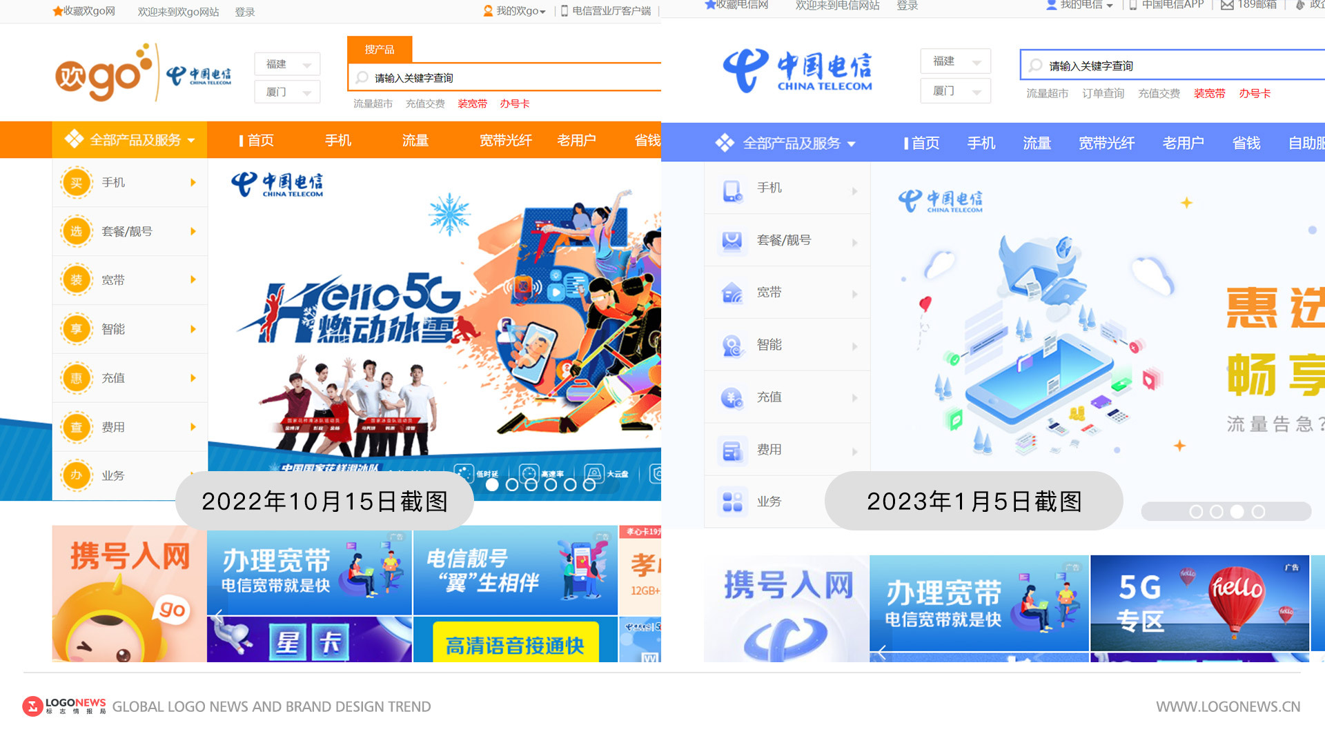 網(wǎng)上營業(yè)廳左上角的LOGO移除了橙色的「歡go」圖標(2015年推出的服務),只保留了最新顏色的中國電信LOGO。其頁面其他元素如導航菜單、產(chǎn)品圖標等均從橙色更改為亮藍色(#688CFF)。由于沒有找到新版(顏色)LOGO的高清圖,暫時還不清楚此次更新是否微調(diào)了圖形或中英文字體。從小圖來看,除了顏色變化外,圖形和字體還是保持了原來的造型。