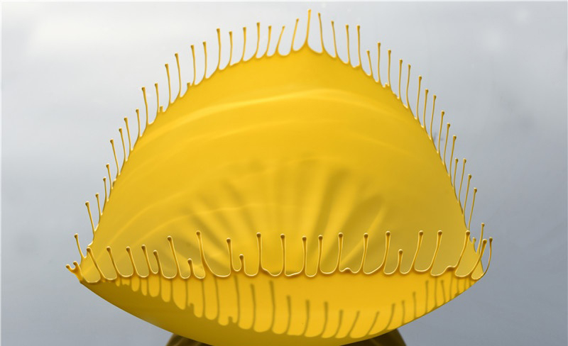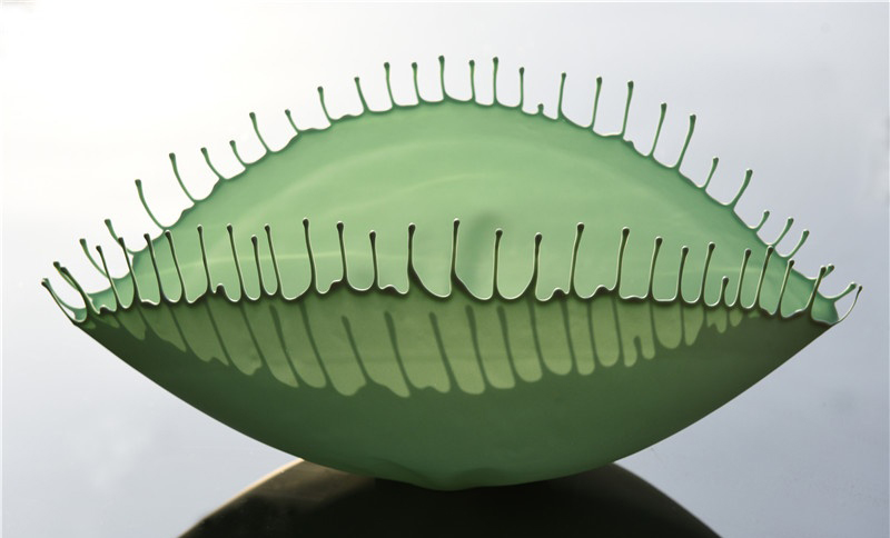 玻璃,是對于東方視覺世界的象征,即,它不是一種固體,而是一種高度黏稠的液體,即使它看起來具有形體,實(shí)際上是欠缺和難以捉摸的,甚至光的加入也不能發(fā)揮它的作用。卞曉東的瓷器,以薄如蟬翼的薄胎瓷表現(xiàn)了一個(gè)破繭成碟后的蠶繭,胎體上的褶皺與濺出的須柱是模擬小小個(gè)體在蛻變前迸發(fā)的強(qiáng)大力量,代表蛹從繭中出現(xiàn)的瞬間,一種變化的形態(tài),不是雕刻石頭,而是水的跳躍。