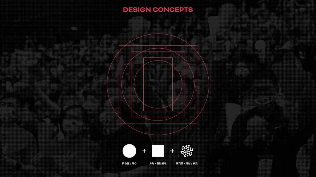 家的齊心——同心圓/方形結構的運動場——四方型以及代表回憶與精采賽事——萬花筒結構,發(fā)展出新視覺系統(tǒng)與LOGO。
